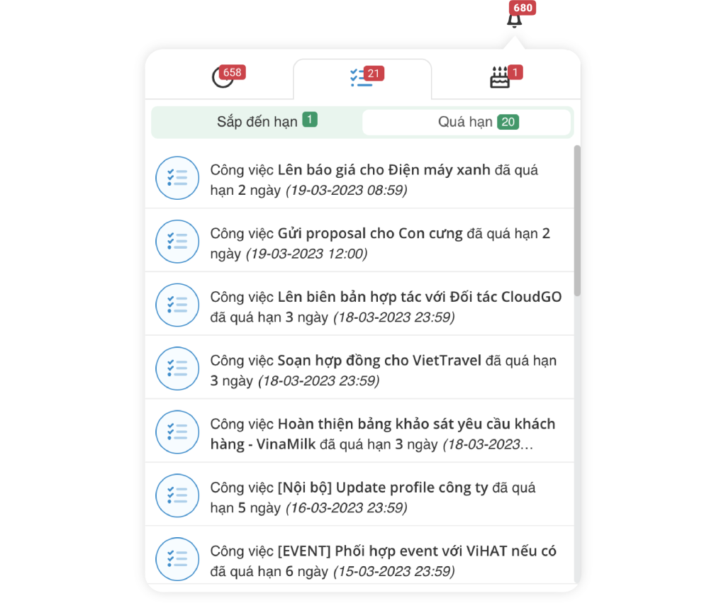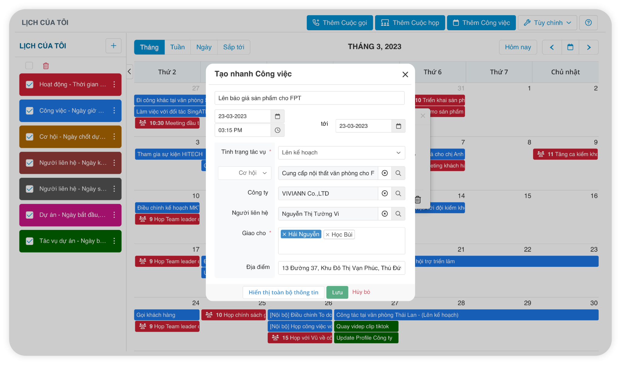 Nhân viên có thể dễ dàng tạo lịch làm việc theo ngày, tuần, tháng cho bản thân. Đặc biệt, hệ thống có thể theo dõi tất cả các loại dữ liệu có kiểu ngày tháng trên màn hình Lịch của tôi ví dụ như ngày bắt đầu dự án, ngày ký kết hợp đồng, ngày đặt hàng, ngày sinh nhật liên hệ, ngày thành lập công ty …